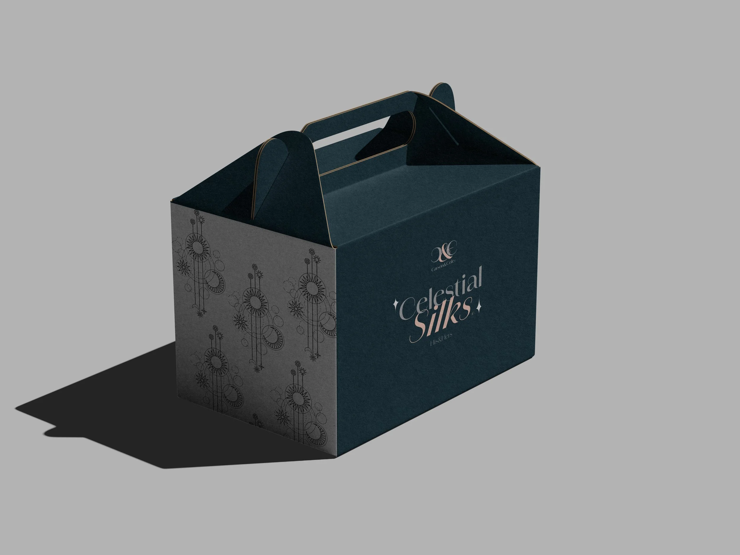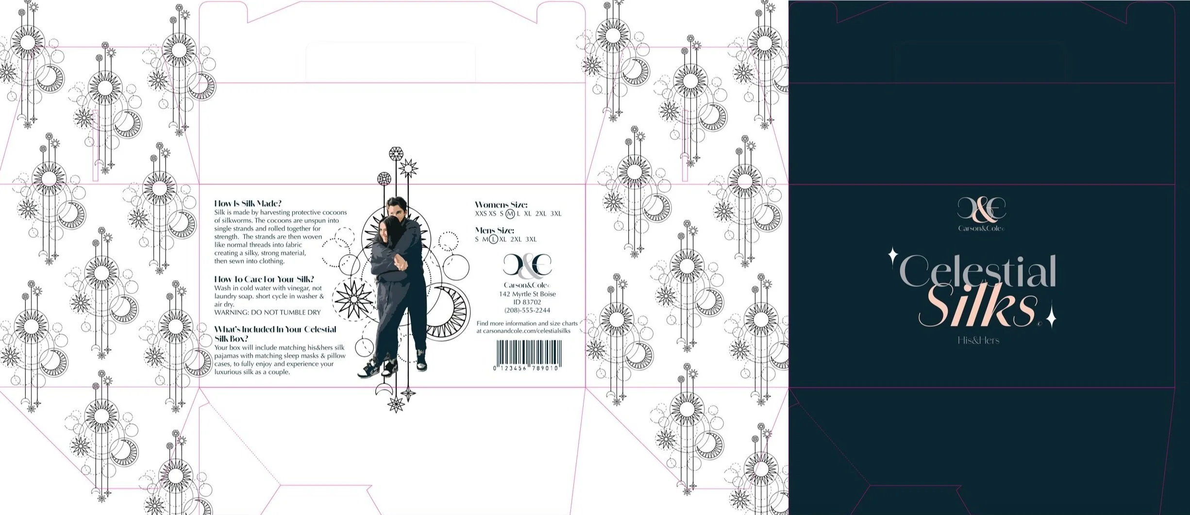 For this project, I designed the packaging for Celestial Silks, a luxury his-and-hers pajama box set crafted from ultra-soft silk with a celestial-inspired theme. The goal was to create a packaging experience that felt as indulgent and romantic as the sleepwear inside — like unwrapping a little piece of the night sky.